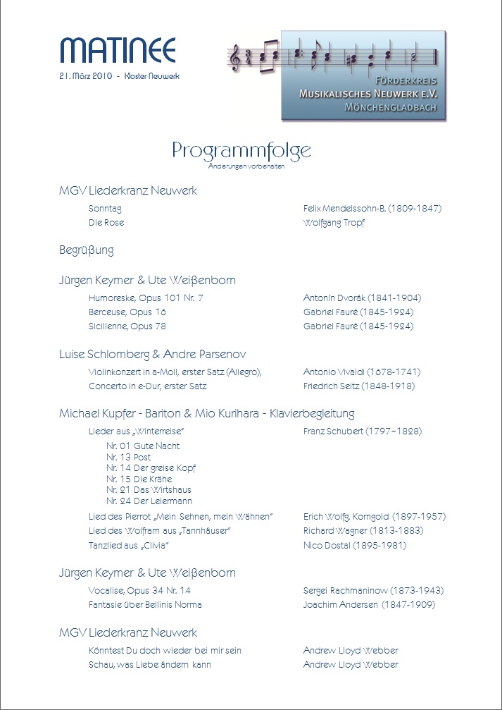 Am Sonntagmorgen, dem 21.03.2010, fand die zweite Matinee des Förderkreises statt. Sie wurde - wie schon im Vorjahr - wieder auf der Nonnenempore der Klosterkirche von Neuwerk abgehalten.