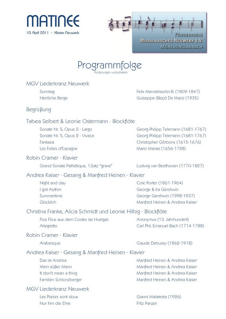Am Sonntagmorgen, dem 10.04.2011, fand die dritte Matinee des Förderkreises statt. Wegen der immer größer werdenden Besucherzahl wurde sie erstmalig im Chorraum der Klosterkirche von Neuwerk abgehalten.